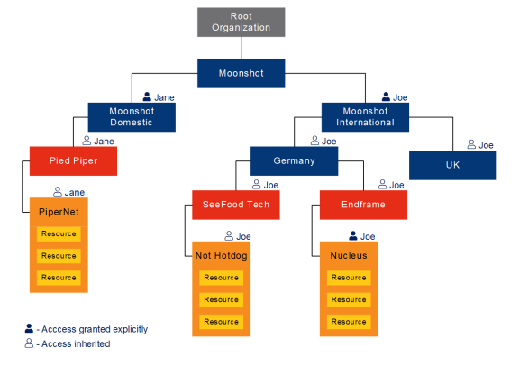 In the example shown above, the Resources/Assets (shown in yellow) are nested inside the Projects (shown in orange), which then fall under two Organizations (shown in red).User Access