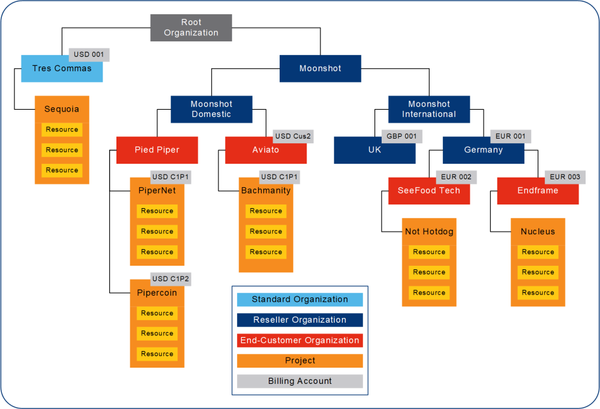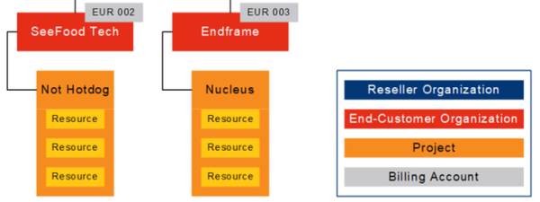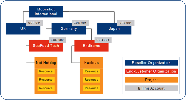 In this example, the reseller has created separate organizations and projects for their end-customers. Each project entity has been assigned a set of product specific assets required to carry out a given end-customer commitment.