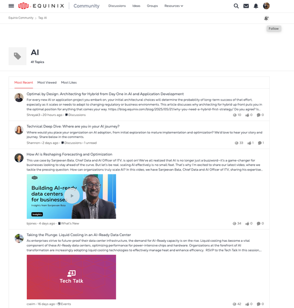 - Select the top right follow button to follow all AI content within Community.