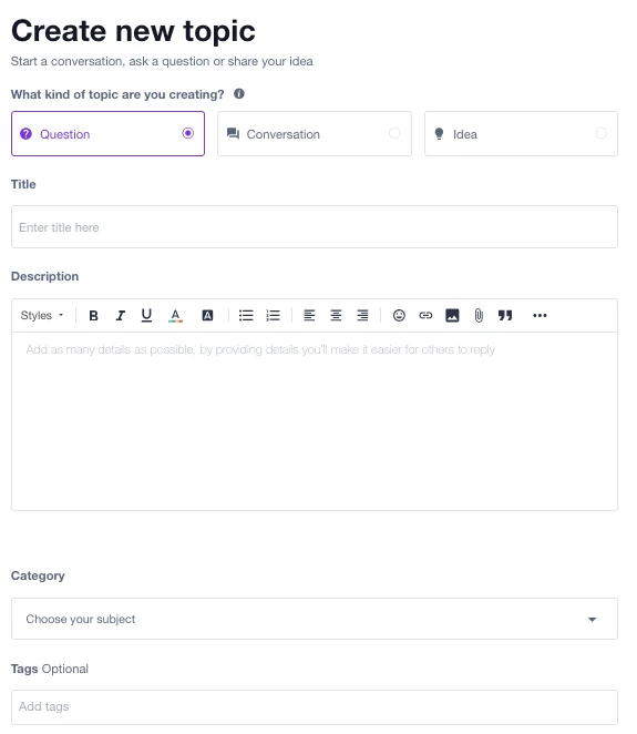 Tags are optional when creating a new topic and you can always add them later. For example, when creating a topic in a general support forum for troubleshooting, and you're having connectivity issues with your smart phone, you might apply labels like "Connection Issue" or "Phone"