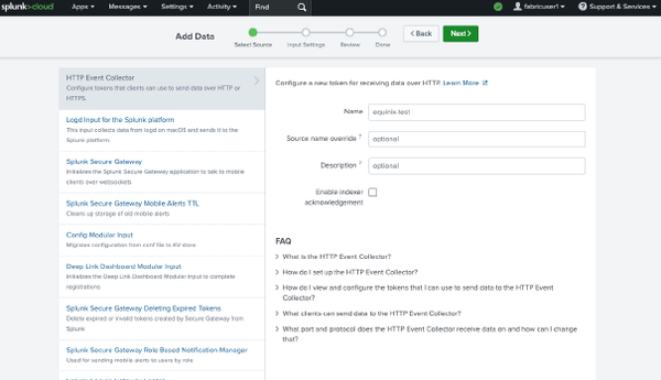 - After naming your HTTP Event Collector, click Next on the Select Source Step.
