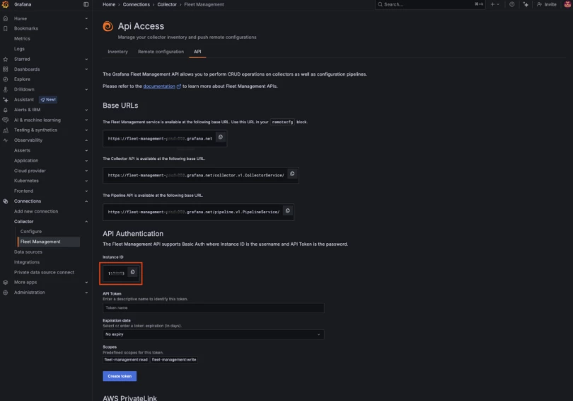3. Copy the Token, Grafana Endpoint, and Instance Id to create Grafana Subscription