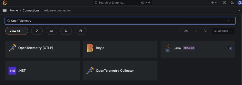 - Search for “OpenTelemetry” and press enter to filter the connection options.