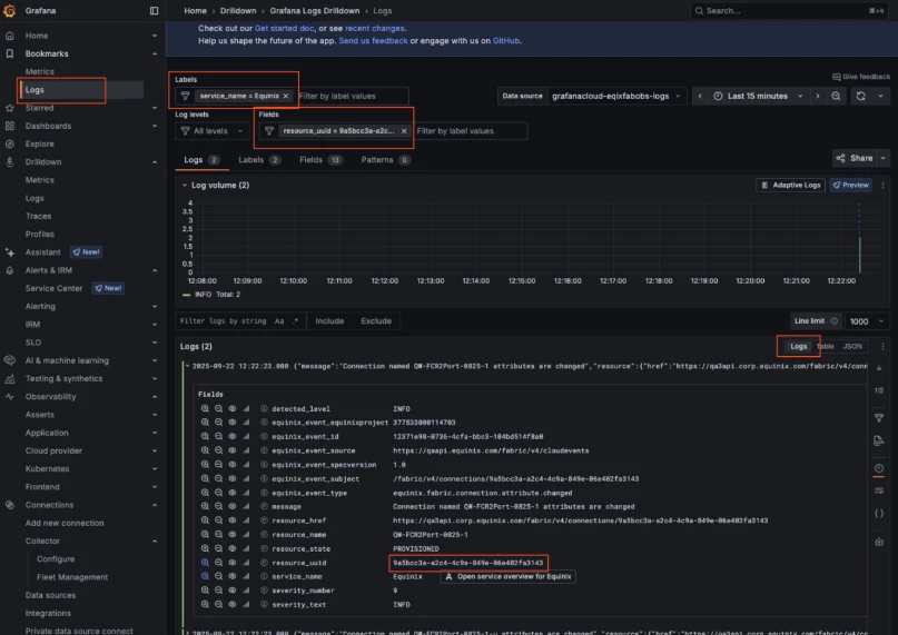 - In the Labels Search Bar Search by "service_name = Equinix"
