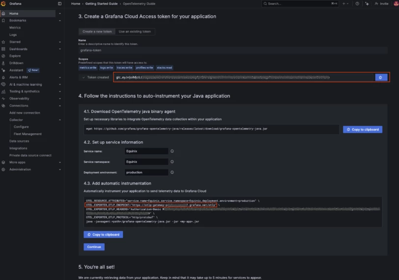 - Ensure that the token and OTEL_EXPORTER_OTLP_ENDPOINT values during this process are saved securely. The token and OTEL_EXPORTER_OTLP_ENDPOINT are required for further integration or data ingestion processes.