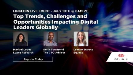Hey community! Michael from the Equinix Social Media team here. We'll be hosting a LinkedIn Live event on July 19th featuring guests Maribel Lopez (Founder and Principal Analyst, Lopez Research), Keith Townsend (CEO and Founder, The CTO Advisor) and Leanne Starace (SVP, Global Solutions Architecture and Engineering, Equinix). They'll be discussing Digital Transformation and Digital Infrastructure trends discovered in our 2022 Equinix Global Tech Trends survey. Tune into the LinkedIn Live Event here and be sure to follow us on LinkedIn Let us know if you'll be tuning in and if there's any live events you'd like to see in the future.5KViews1like0Comments
